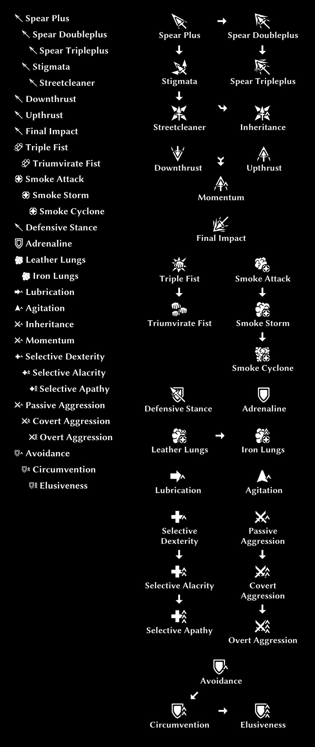 Assuming some of the longer skill names wouldn’t fit side by side, I started off with an expanded version of the bulleted-list with one item per column, but managed to get everything to fit (in English, at least).